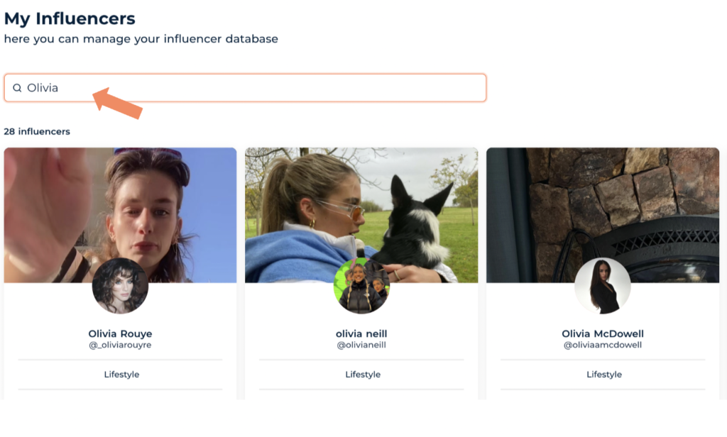 This feature helps users easily search and locate an influencer in the database. Please note that the search engine will only enable you to find influencers who are already in the Database.