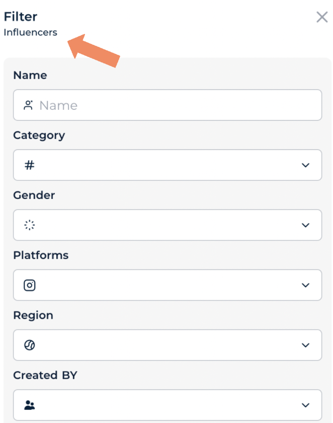 5. Selecting the filters icon will present you with a form that allows you to search influencers based on specific criteria such as :
