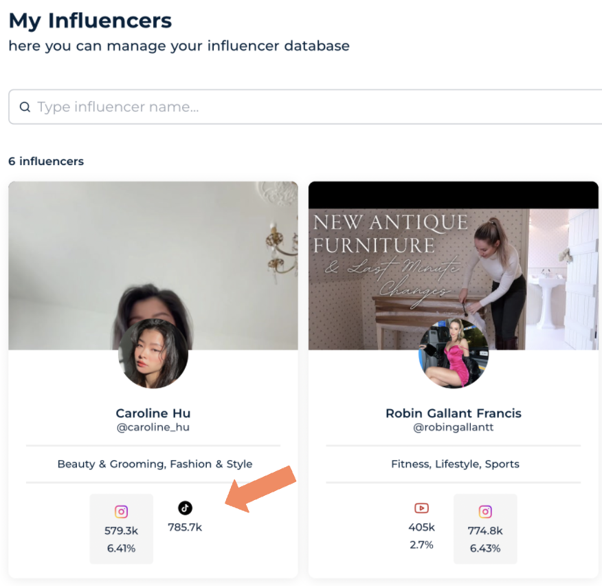 2. In the database you will be presented with snapshot versions of the influencer profiles. These include key information : e.g. Influencer category, the influencer’s current follow count and the influencer’s average engagement rate.