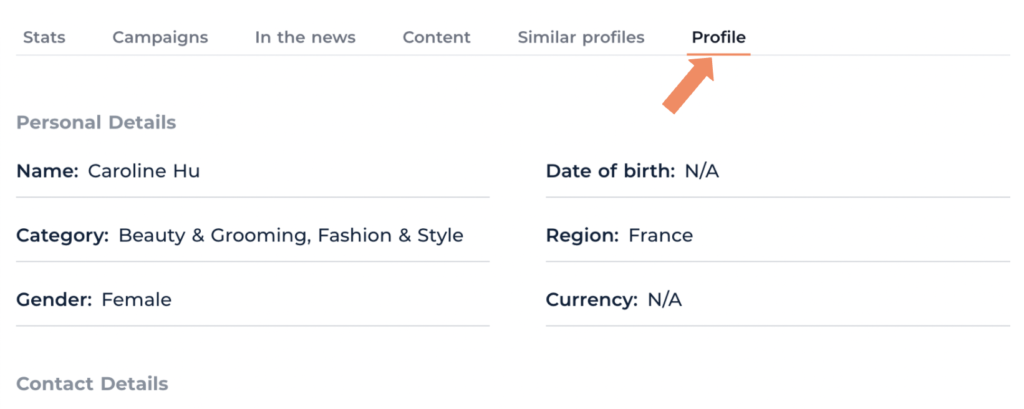 8. Last but not least , the ‘Profile’ tab contains all of an influencer’s personal details such as their Category, Region, Contact details etc.